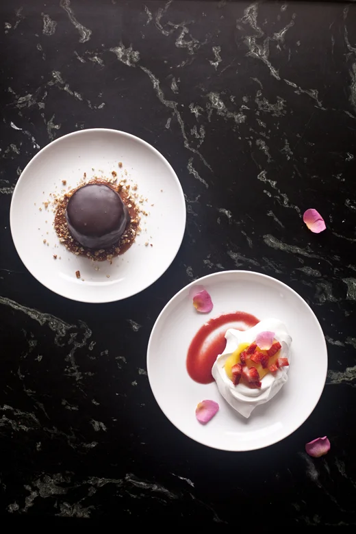What if the car was too warm and melted stuff? Or we got rear-ended? Or went over a bumpy road and the cakes toppled over? And the scariest thing: What if the kitchen screwed up the desserts I'd spent the last two days working on?My helper (aka the husband) and I got everything there in one piece. The kitchen plated the desserts exactly as I'd asked... even though the chef wanted to top my precious chocolate cakes with caramel sauce in a latticed fashion.